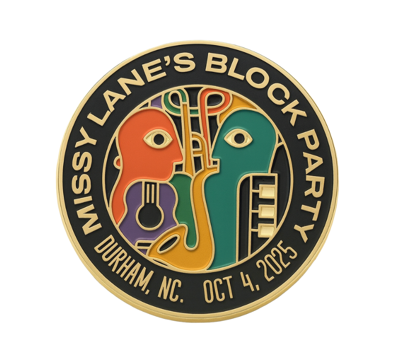 A true collector’s piece, this limited-edition enamel lapel pin commemorates the inaugural Missy Lane’s Block Party in Durham, NC. Crafted with a gold trim, the design features bold, abstract jazz-inspired faces intertwined with a saxophone, piano keys, and guitar — capturing the soul of music and community. With “Missy Lane’s Block Party – Durham, NC – Oct 4, 2025” etched around the edge, this pin is both a wearable statement and a timeless keepsake. Perfect for jackets, hats, or bags, it’s a small but powerful way to carry the Block Party wherever you go.